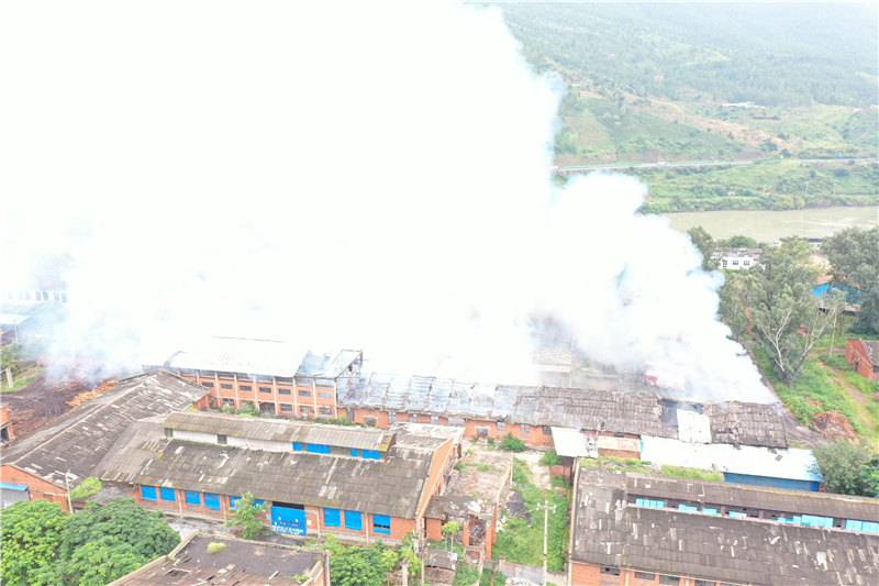 航拍格里坪木材厂火灾全景。