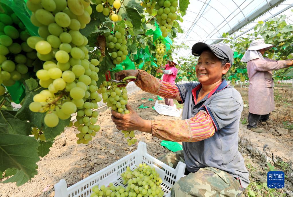 8月26日,全椒县六镇镇牧龙山现代农业示范园农民在采摘葡萄。新华社发(沈果 摄)