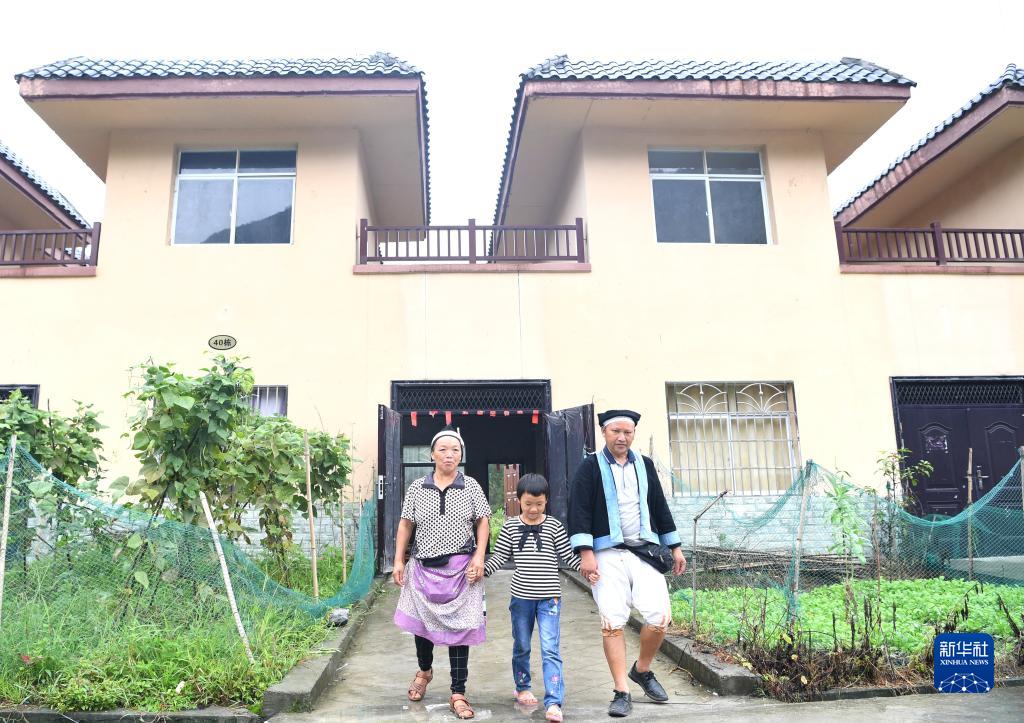 在广西南丹县八圩瑶族乡瑶寨移民安置点,村民黎治明(右)一家走出新家家门(2020年8月6日摄)。
