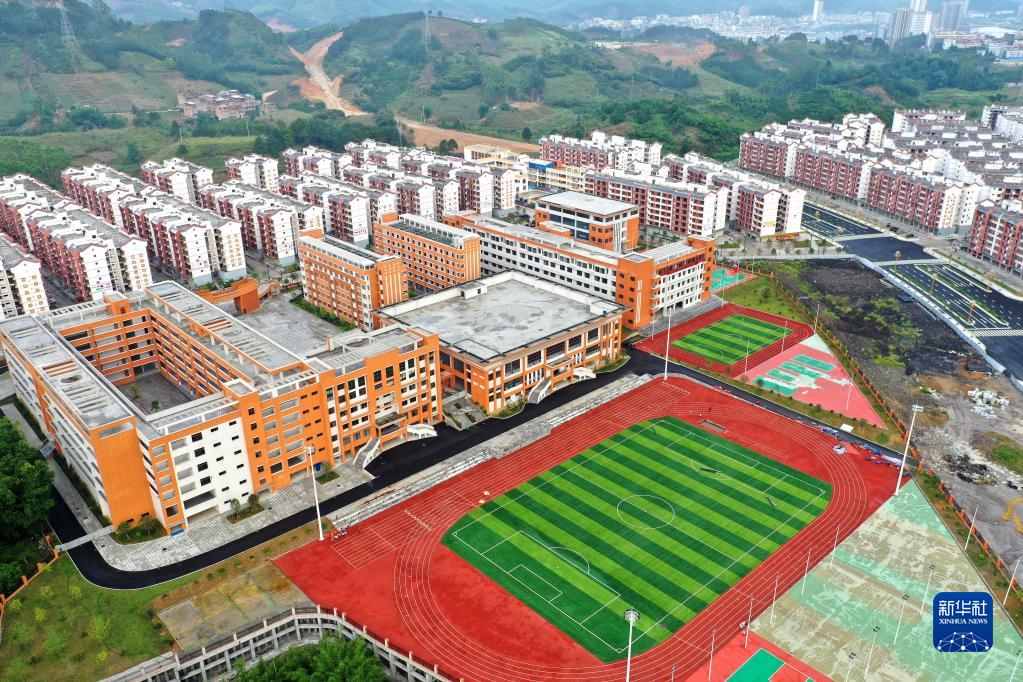 广西环江毛南族自治县毛南家园易地扶贫搬迁城北安置区外新的学校(2020年5月21日摄,无人机照片)。
