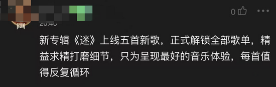 毛不易在平台评论区回应质疑:“20元是包含了整张专辑,之后的歌曲上线都不需要重复购买。”在毛不易的回复中,也明确提及了分批上线歌曲是出于企划和制作的考虑。这也表明在数字专辑时代,专辑不再是制作完毕才能发行,而可以处于“动态”制作中。