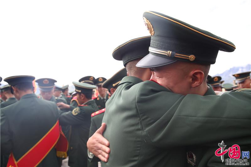 图为退役士兵眼含热泪与战友告别。摄影:邱华林