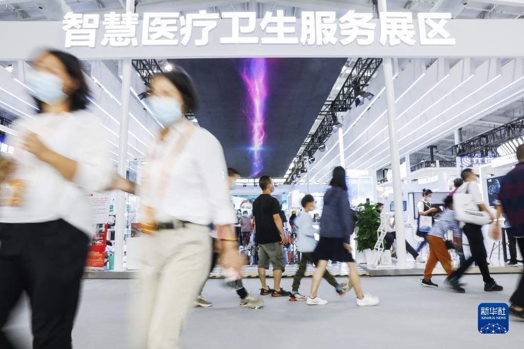 9月5日,观众在服贸会首钢园区健康卫生服务专题展的智慧医疗卫生展区前走过。