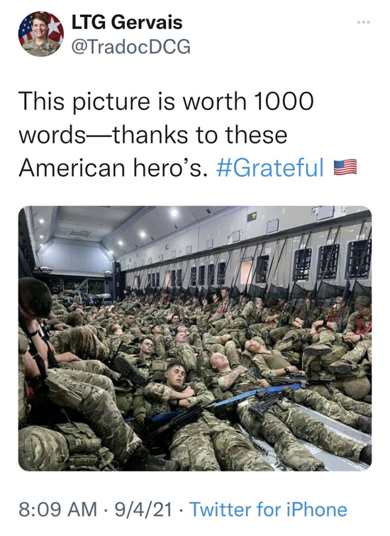 近日,美国陆军中将玛利亚·R·热尔韦在境外社交媒体推特上发布的一则帖文引起了极大的争议。在这条9月4日发布的帖文中,热尔韦称:“这张照片值得大书特书,感谢这些美国的英雄”,并配上了一张在运输机内休息的疲惫不堪的士兵们的照片。