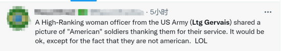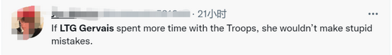 对于热尔韦的错误发言,有外国网友调侃称,“一位美国陆军高级将领分享了一张‘美国’士兵的照片并表示感谢,除了最关键的内容,他们不是美国人,其他的都很正确”;有网友指责称,“如果热尔韦多花点时间关心军队,她就不会犯这个错误”;还有网友表示,“热尔韦是奥巴马时代晋升的将军,这些事都不让人意外”。