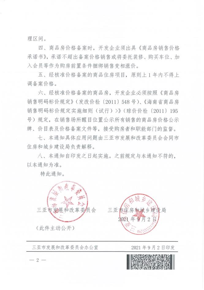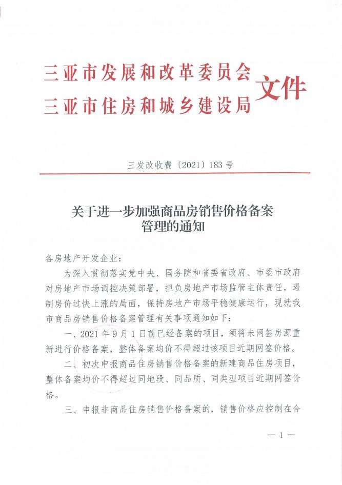 中国网9月8日讯 据海南省三亚市发改委消息,三亚市发改委与市住房和城乡建设局近日联合印发《关于进一步加强商品房销售价格备案管理的通知》(以下简称《通知》),明确申报非商品住房销售价格备案的,销售价格应控制在合理区间;经核准价格备案的商品住房项目,原则上1年内不得上调备案价格。