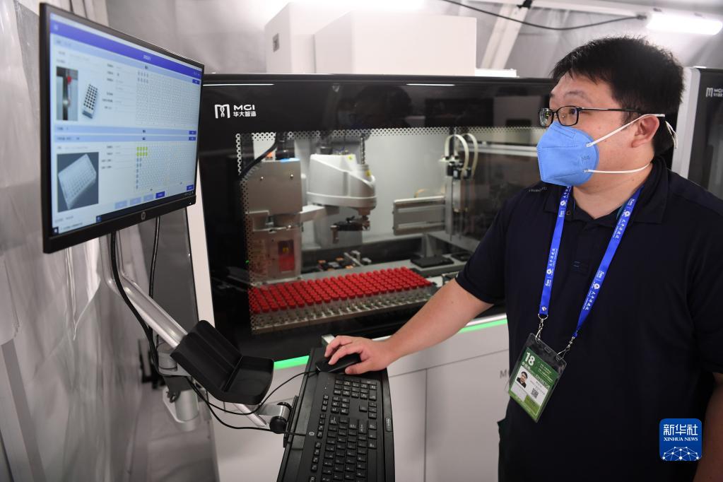 9月10日,在深圳华大基因科技展台,工作人员在火眼实验室介绍一套全自动分杯处理系统。新华社记者 马宁 摄