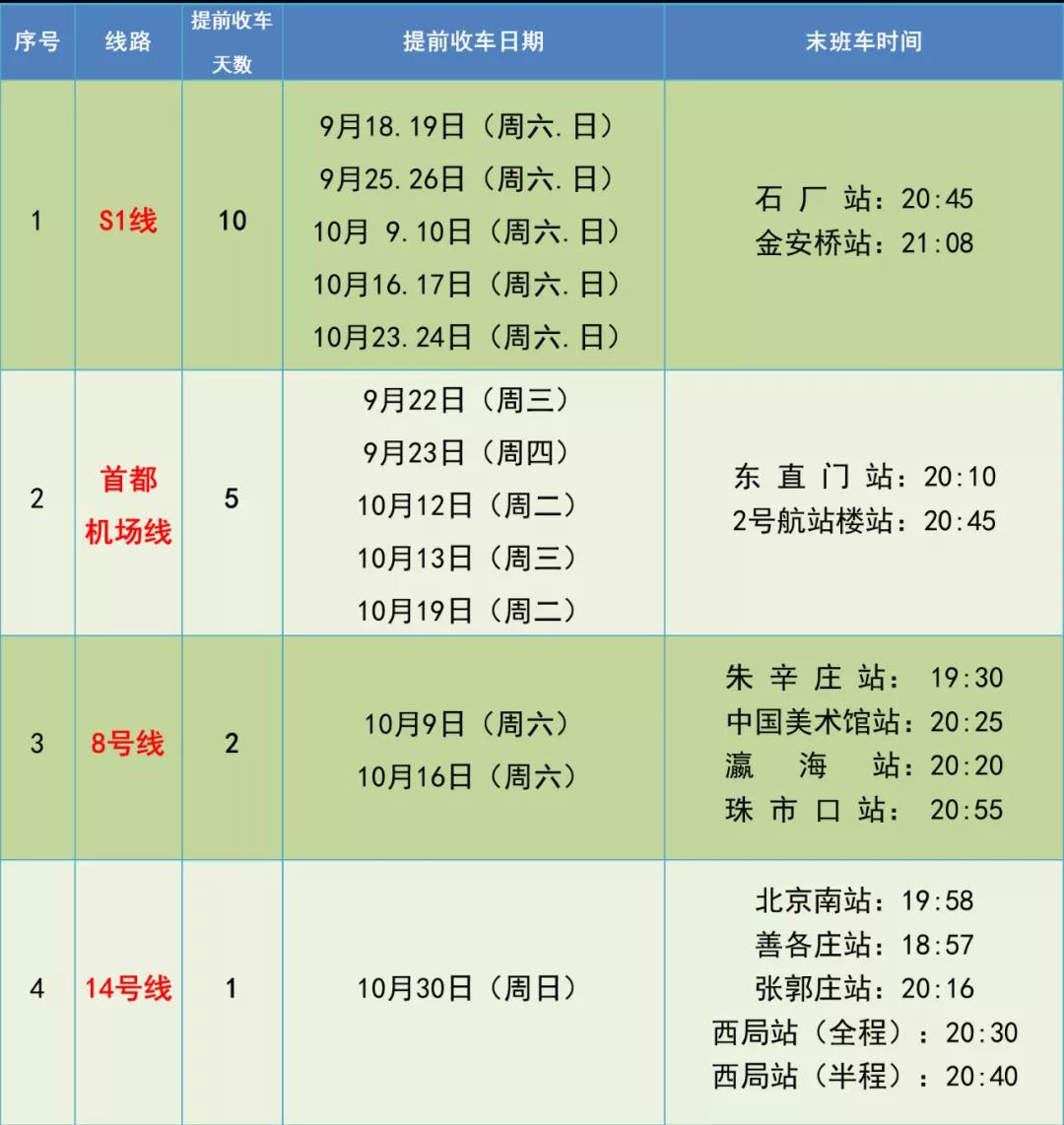 首都机场线,计划于9月22日(周三)、9月23日(周四)、10月12日(周二)、10月13日(周三)、10月19日(周二),共计5次提前收车。机场线东直门站末班车提前至20:10,2号航站楼站末班车提前至20:45。
