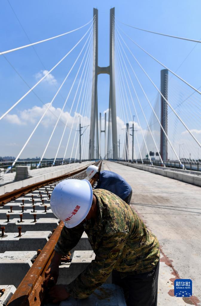 9月15日,施工人员在广州南沙港铁路跨西江特大斜拉桥铺轨现场作业。近日,由中铁十一局承建的粤港澳大湾区基础设施“硬联通”重点工程——广州南沙港铁路跨西江特大斜拉桥完成桥面左线铺轨施工,为工程如期建成开通奠定基础。该桥位于广东佛山市和江门市交界处,全长1117.5米。新华社记者 刘大伟 摄