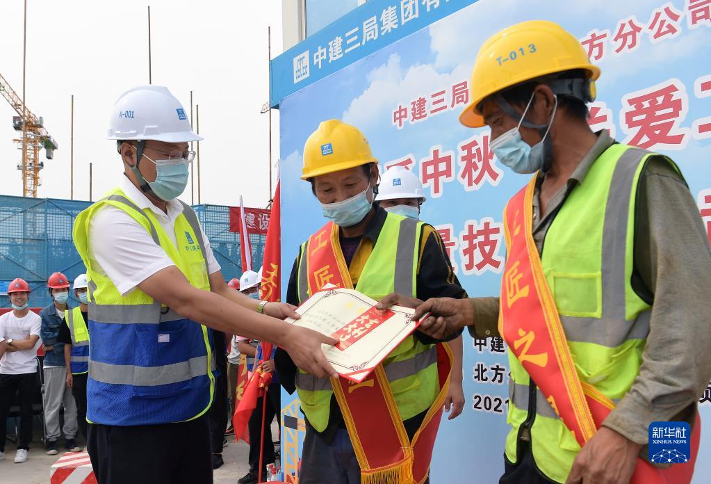 9月18日,工地负责人为比赛获胜的施工人员发放证书和奖金。