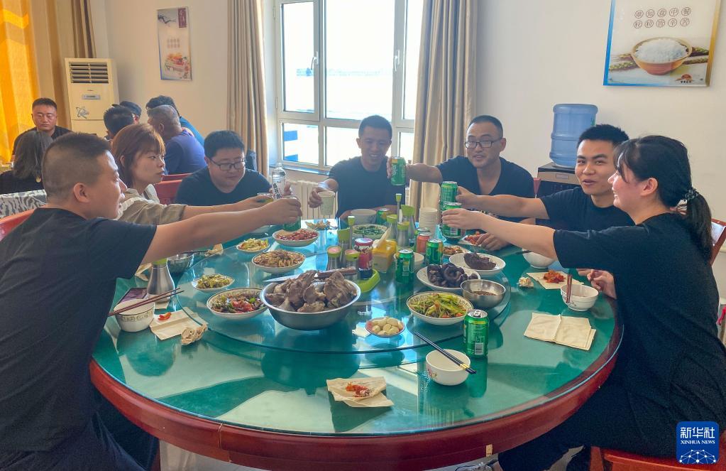 9月21日,杨鑫楠(左一)和同事们一起过中秋节。