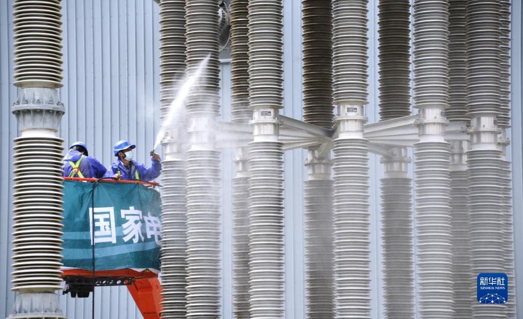 9月25日,国网北京市电力公司延庆换流站的员工在清洗绝缘立柱。