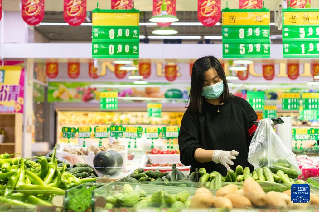 9月25日,哈尔滨市巴彦县一大型超市工作人员为线上下单的居民挑选果蔬。新华社记者 谢剑飞 摄