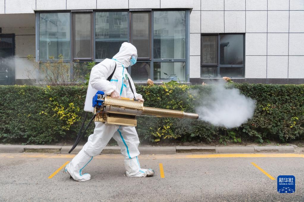 9月25日,哈尔滨市巴彦县志愿者协会志愿者在巴彦县一小区内进行消毒。新华社记者 谢剑飞 摄