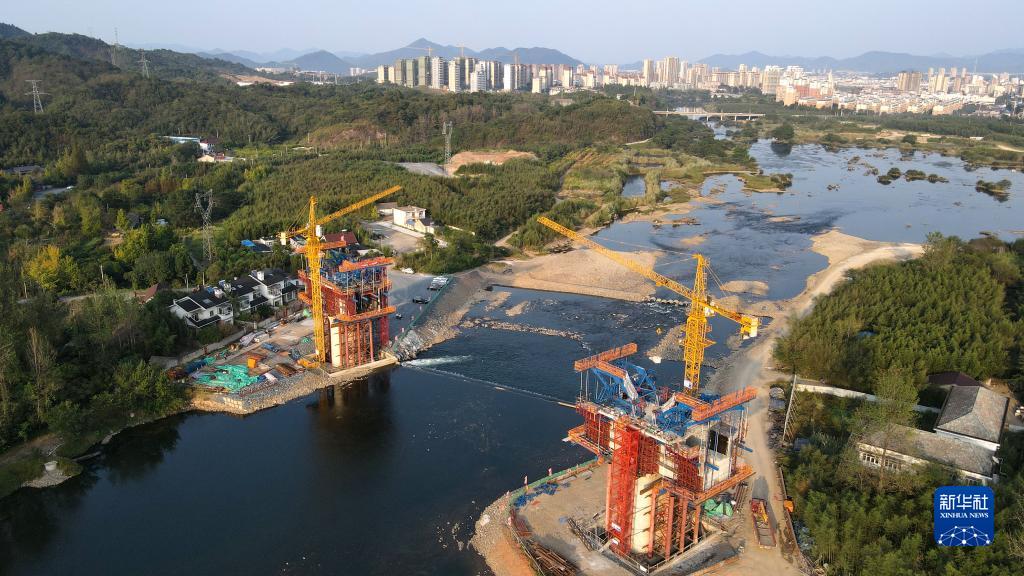 10月3日拍摄的中铁五局宣绩铁路西津河特大桥施工现场(无人机照片)。