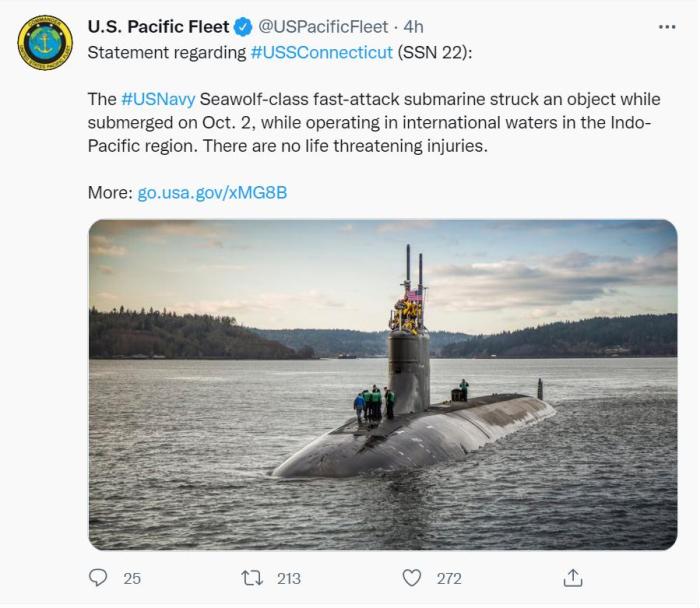 据美媒报道,“康涅狄格号”上的部分船员在事故中受伤,但伤者并无生命危险。目前尚不清楚这艘潜艇可能与什么物体发生碰撞。