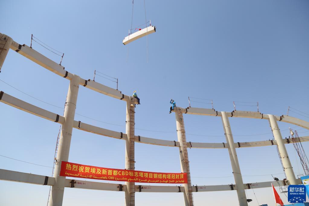 这是2021年8月24日拍摄的埃及新首都中央商务区标志塔主体钢结构封顶现场。新华社发(黎炳宏 摄)