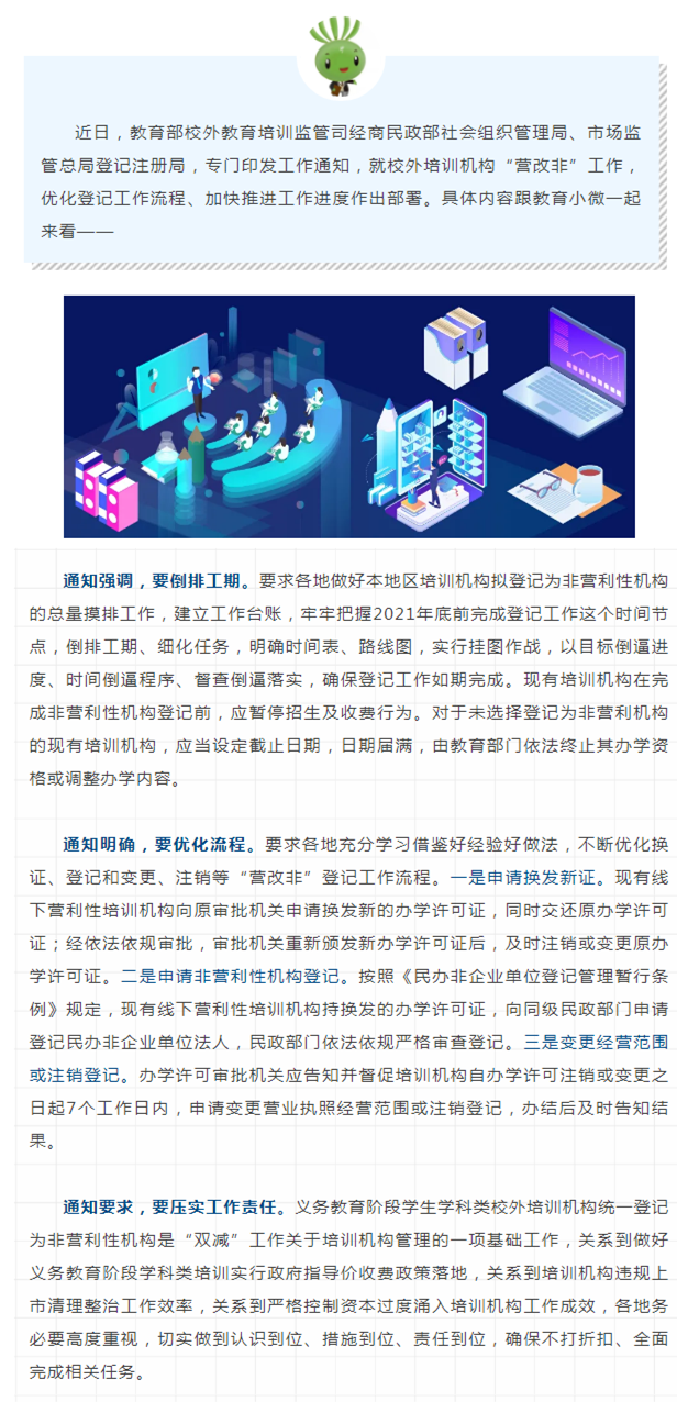教育部:优化校外培训机构“营改非”登记工作流程、加快工作进度