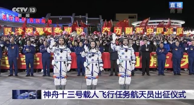 神舟十三号载人飞行任务航天员乘组出征仪式,在酒泉卫星发射中心问天阁广场举行。