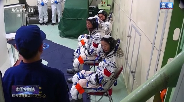 3名航天员到达发射塔架,准备进入神舟十三号返回舱,等待飞船发射。