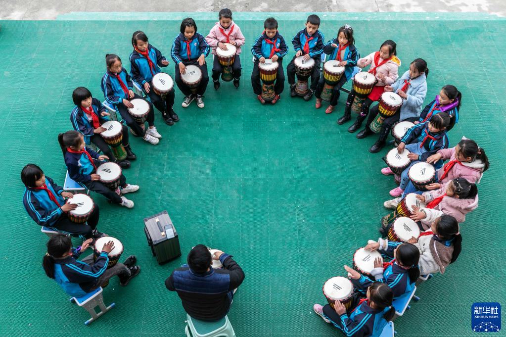 10月22日,贵州省黔西市林泉镇高锦小学学生在练习手鼓。
