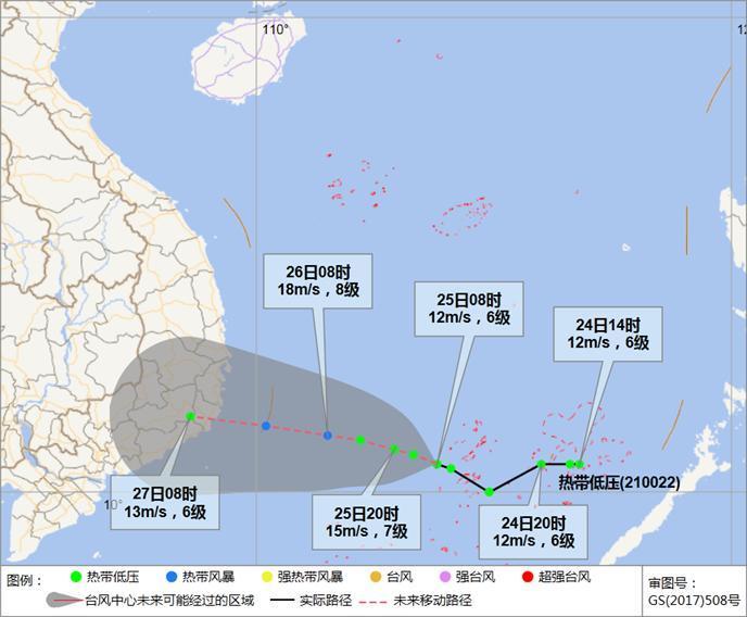海南省气象台预计,该低压将以每小时10公里左右的速度向西偏北方向移动,强度缓慢增强,可能于26日发展为台风(热带风暴级),并将于27日凌晨到上午在越南东南部一带沿海登陆(热带低压或热带风暴级,7~8级,15~18米/秒)。
