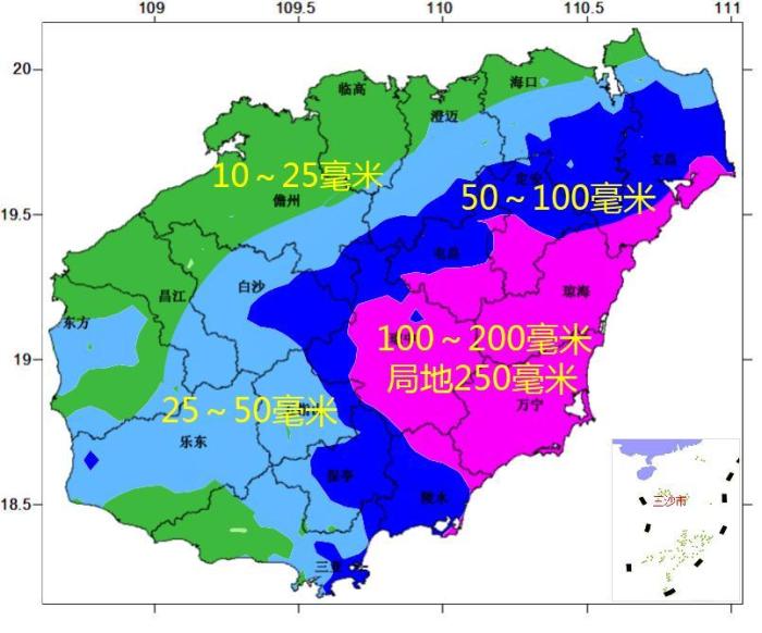 陆地方面:25日~26日白天,受冷空气影响,海南岛北部、东部和中部地区多云间阴天,局地有小雨,西部和南部地区多云。26日夜间~29日白天,受热带气旋外围环流和冷空气共同影响,海南岛东半部地区有大到暴雨、局地大暴雨,西半部地区有小到中雨、局地大雨。