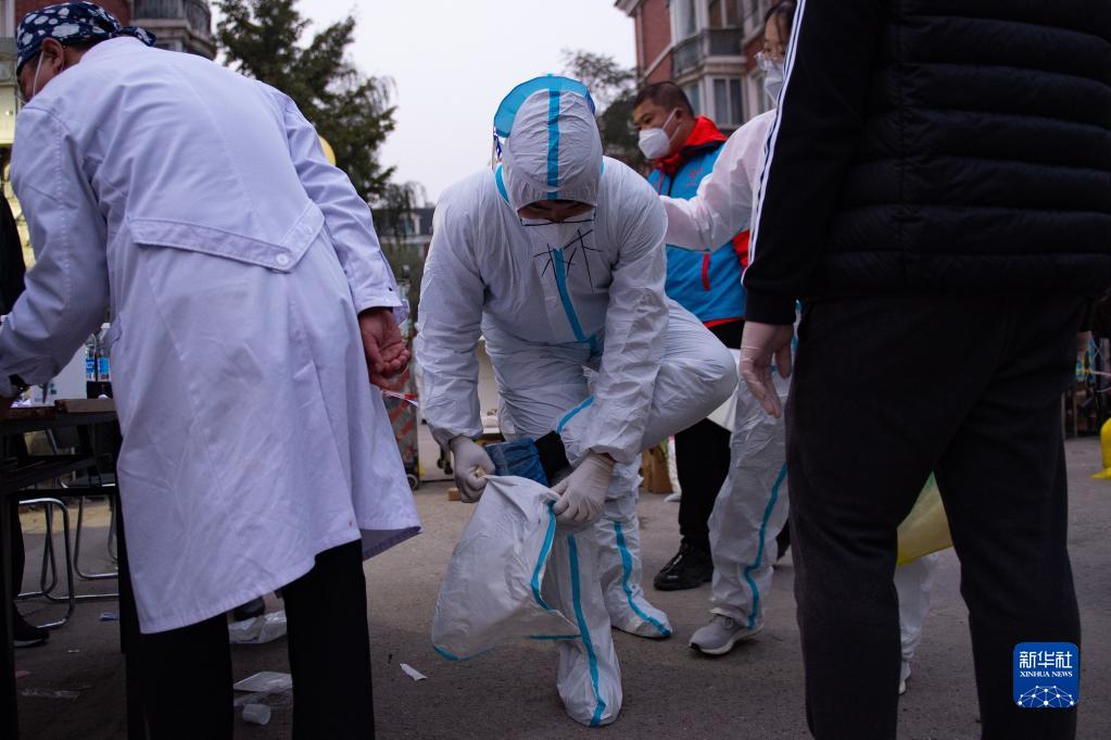 10月25日,一名即将进入小区的疫情防控人员(中)在穿戴防护鞋套。