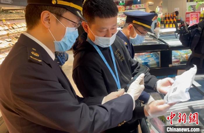 今天,北京市东城区市场监管局执法人员到位于崇文门附近的盒马鲜生超市,对进口冷链食品疫情防控工作开展现场检查。执法人员检查了进口冷藏冷冻肉类和水产品、进口冷冻食品是否加贴“北京冷链”追溯码经营,是否落实“四无五不”要求,即无检验检疫证明、无核酸检测报告、无消毒证明、无“北京冷链”追溯信息的进口冷链食品,一律不采购、不使用、不运输、不贮存、不销售。同时,重点检查冷链从业人员是否严格按照指引要求,规范佩戴口罩、手套,以及是否按要求进行核酸检测。