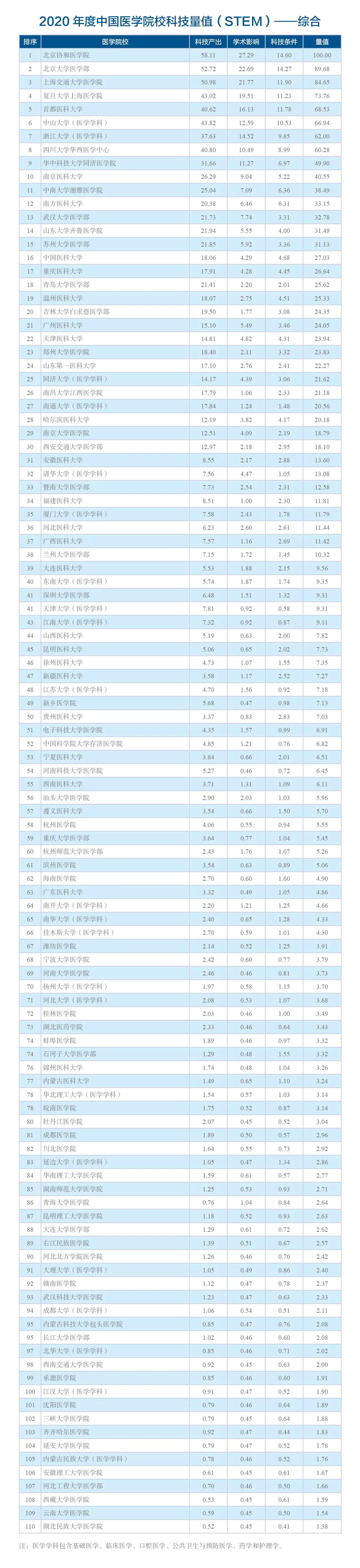 今年对全国110所独立医学院校和设立医学学科的综合大学科技量值进行测算,综合分值位列前10位的医学院校是:北京协和医学院、北京大学医学部、上海交通大学医学院、复旦大学上海医学院、首都医科大学、中山大学(医学学科)、浙江大学(医学学科)、四川大学华西医学中心、华中科技大学同济医学院、南京医科大学。