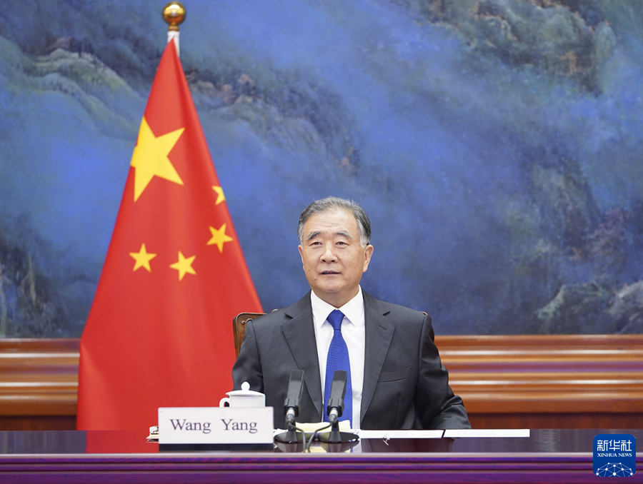 11月3日,全国政协主席汪洋在北京以视频方式会见刚果(布)参议长恩戈洛。新华社记者 高洁 摄