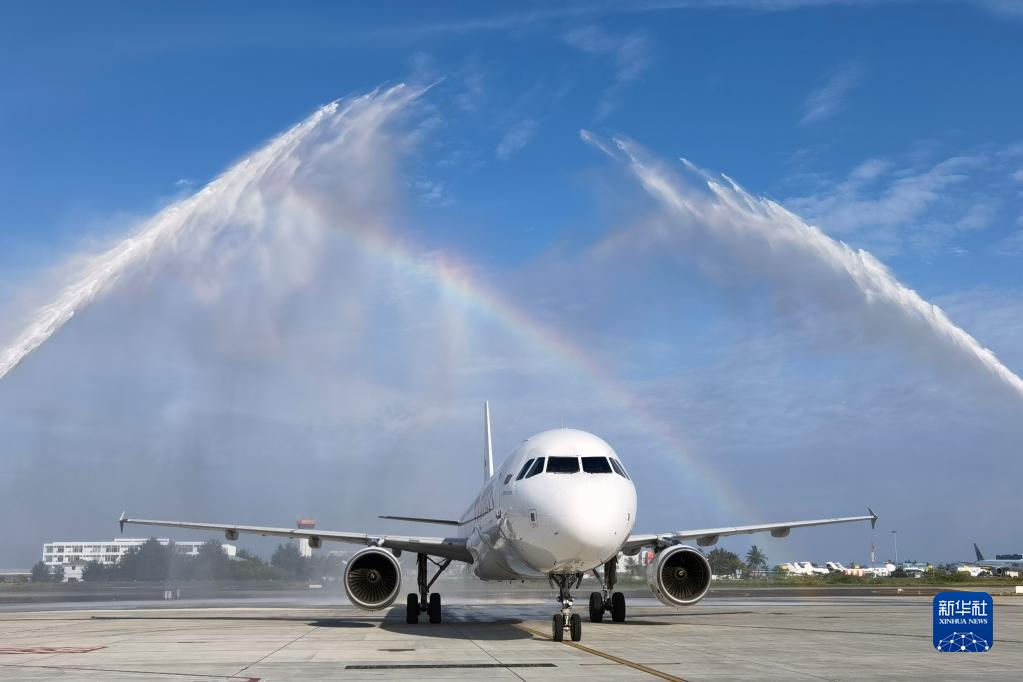 11月4日,马尔代夫马累维拉纳国际机场以水门仪式庆祝西机坪开通。新华社发(北京城建集团供图)