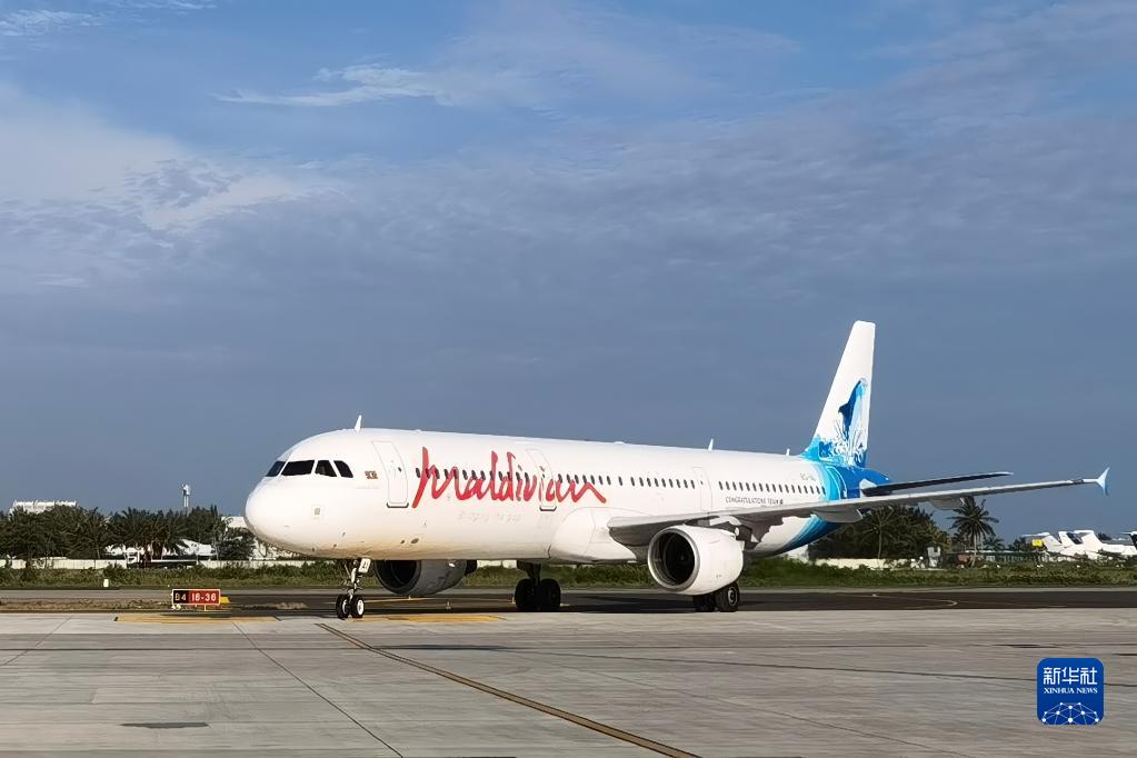 11月4日,在马尔代夫马累维拉纳国际机场,一架马尔代夫航空公司的飞机降落在新开通的西机坪上。新华社发(北京城建集团供图)