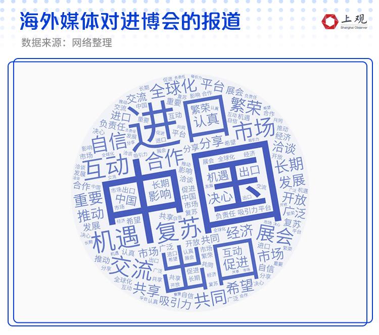 并且,从境外媒体的报道来看,对进博会的态度都较为正面与积极。“互动”、“繁荣”、“合作”、“推动”、“发展”、“机遇”等词频繁出现,各国媒体纷纷肯定中国市场在全球贸易中的重要性,也强调在疫情期间,进博会是一个很好的互动交流平台,以帮助各国的经济复苏。