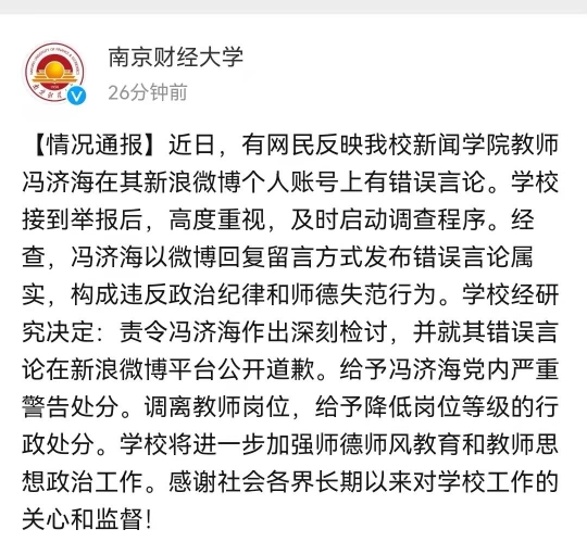 据南京财经大学微博消息,南京财经大学11月28日晚发布情况通报,公布对新闻学院教师冯济海的调查处理结果。通报全文如下: