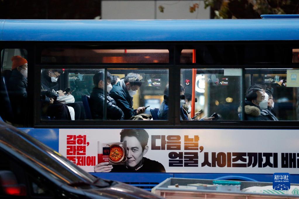 11月29日,佩戴口罩的市民在韩国首尔乘坐公交车。
