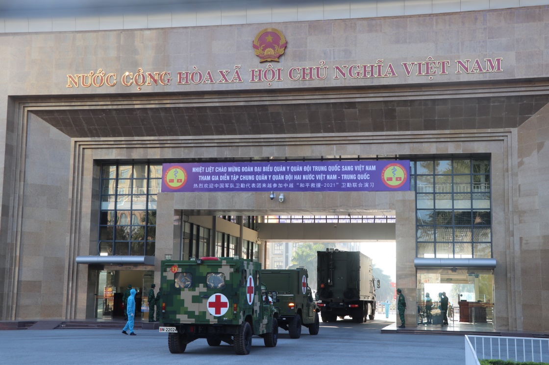 参加中越两军“和平救援-2021”卫勤联合演习的中国军队官兵84人于6日上午采取公路机动方式,通过东兴口岸跨出国门,抵达越南广宁省芒街市演习地域。新华社发(李清竹摄)
