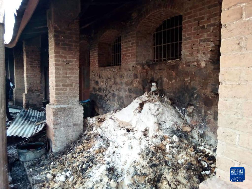 这是12月7日在布隆迪基特加省基特加中心监狱拍摄的被大火烧毁的房屋。