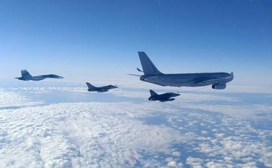 俄军苏-27战斗机(左)伴飞法国加油机和战斗机