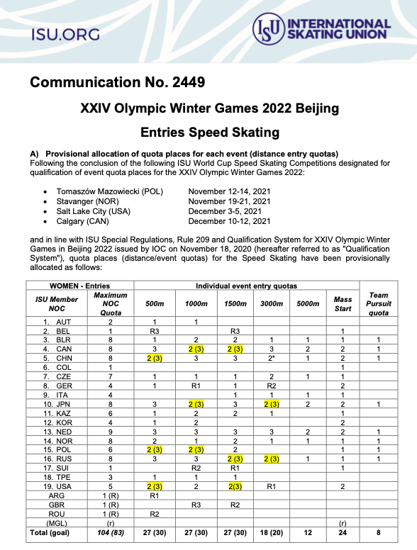 北京冬奥会速度滑冰女子项目席位分配情况。图/国际滑联官网