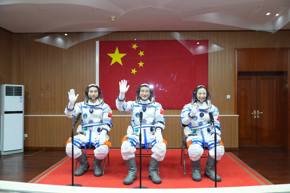 这是10月15日晚,神舟十三号载人飞行任务航天员乘组出征仪式,在酒泉卫星发射中心举行。翟志刚(中)、王亚平(右)和叶光富开启为期6个月的飞行任务。新华社记者 李刚 摄