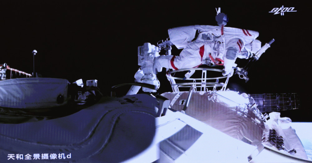 这是11月7日在北京航天飞行控制中心拍摄的神舟十三号航天员翟志刚出舱画面。新华社发(郭中正 摄)