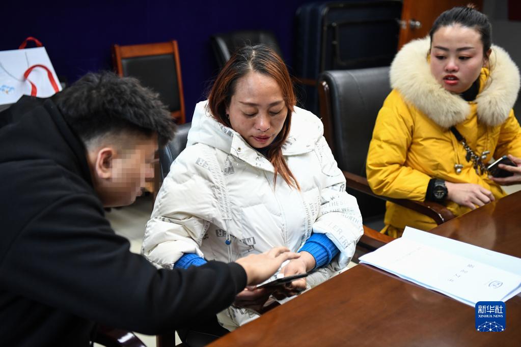 12月28日,在广州市公安局花都区分局刑警大队,罗艳(中)与儿子互加微信。新华社记者 邓华 摄