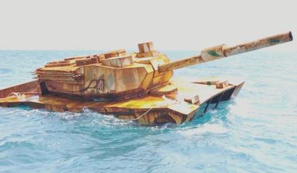 这个漂浮坦克模型正侧面照,其前下方与海水接触部位表明是“空心”。