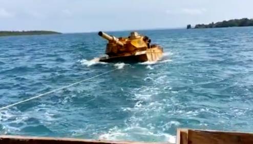 印尼军方拖走该坦克模型的现场画面截图