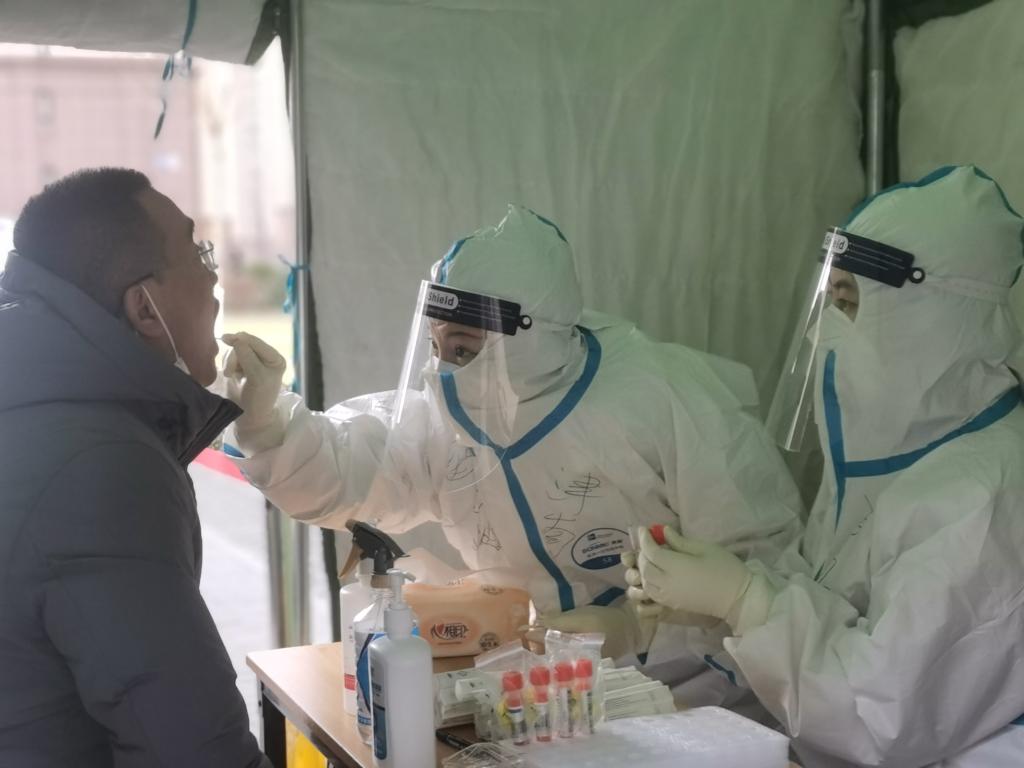 医务工作者为天津市津南区双林街象博豪庭社区(目前属于防范区)居民进行第二轮核酸检测。新华社记者 刘惟真 摄