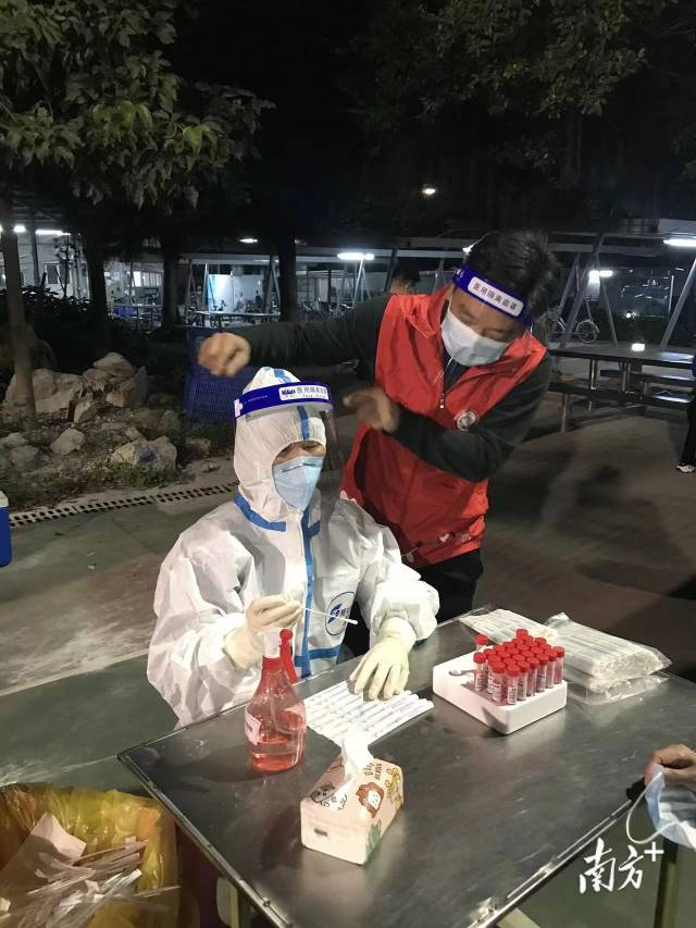 现场前来采样的居民群众很多,夫妻俩连话都顾不上说,整理好面罩和防护服后,他们又马上专注投入工作。一直到凌晨4点,骆文宇和梁小媚才做好收尾工作,梁小媚在骆文宇的帮助下,脱下防护服,一起回家。