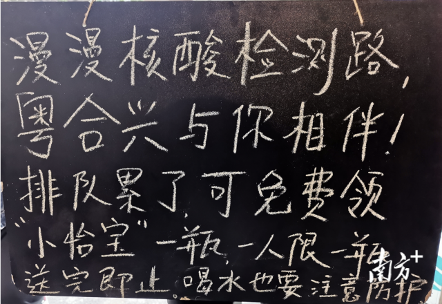 “漫漫核酸检测路,排队累了可免费领小怡宝一瓶,一人限一瓶,送完即止,喝水也要注意防护哦!”