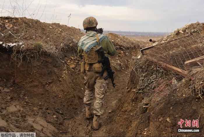 当地时间2021年12月3日,一名乌克兰士兵在乌东部顿涅茨克地区的一处战壕。