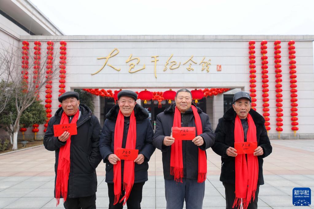 1月26日,在凤阳县小岗村,“大包干”带头人关友江(左一)、严金昌(左二)、严美昌(右二)、严立华(右一)展示自家领取的分红红包。新华社记者 曹力 摄